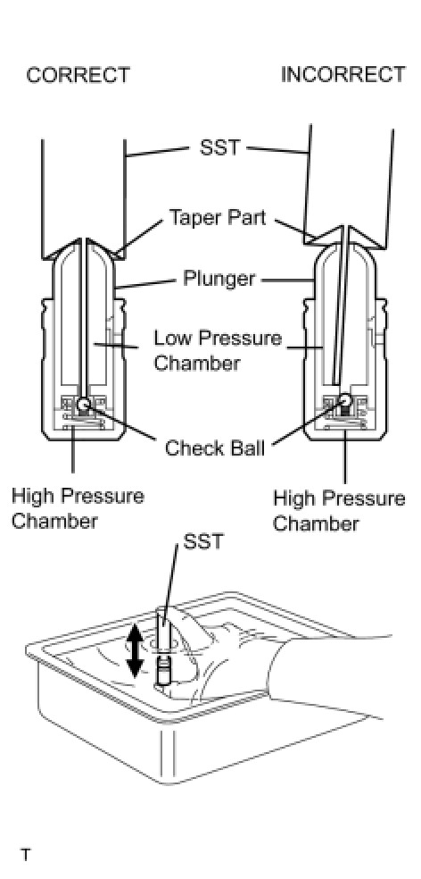 When bleeding air from the high-pressure chamber, make sure that the tip of SST is actually pressing the check ball as shown in the illustration. If the check ball is not pressed, air will not bleed.