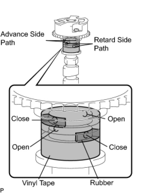 (4) Make sure that the camshaft timing exhaust gear turns in the retard direction when reducing the air pressure applied to the advance side path.