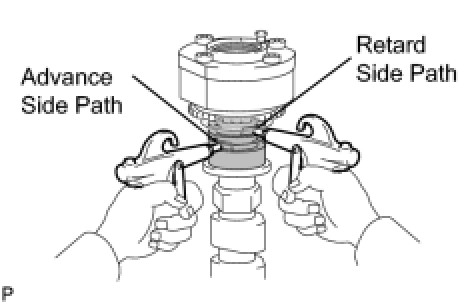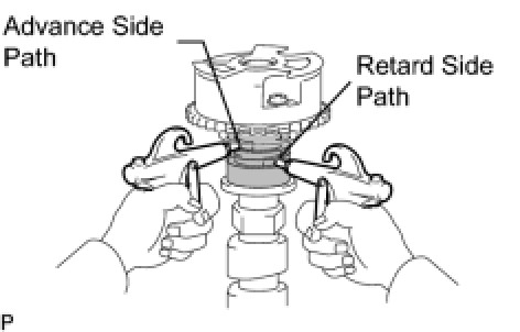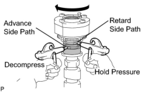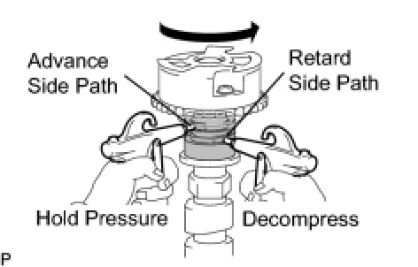 (4) Check that the camshaft timing gear revolves in the advance direction when reducing the air pressure applied to the retard side path.