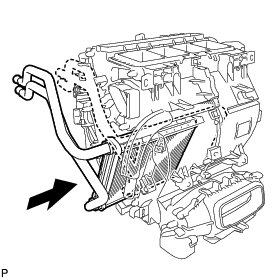 Install the evaporator insulator to the cooler evaporator sub-assembly after making sure that the packing is facing the front of the vehicle as shown in the illustration.