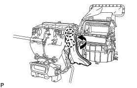 (d) Rotate the link of the air conditioning radiator assembly to the bottom as shown in the illustration and confirm that the mode switching duct hole is fully closed.