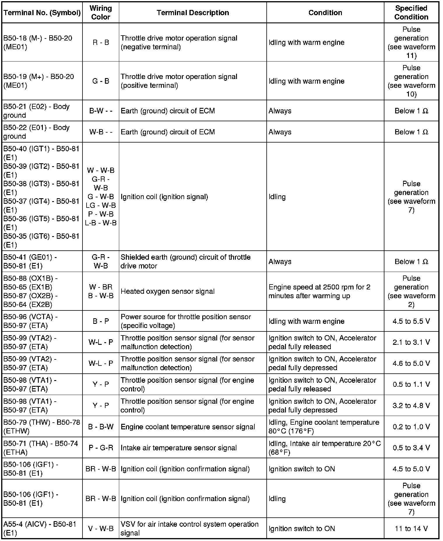 The standard normal voltage between each pair of the ECM terminals is shown in the table below. The appropriate conditions for checking each pair of the terminals are also indicated.