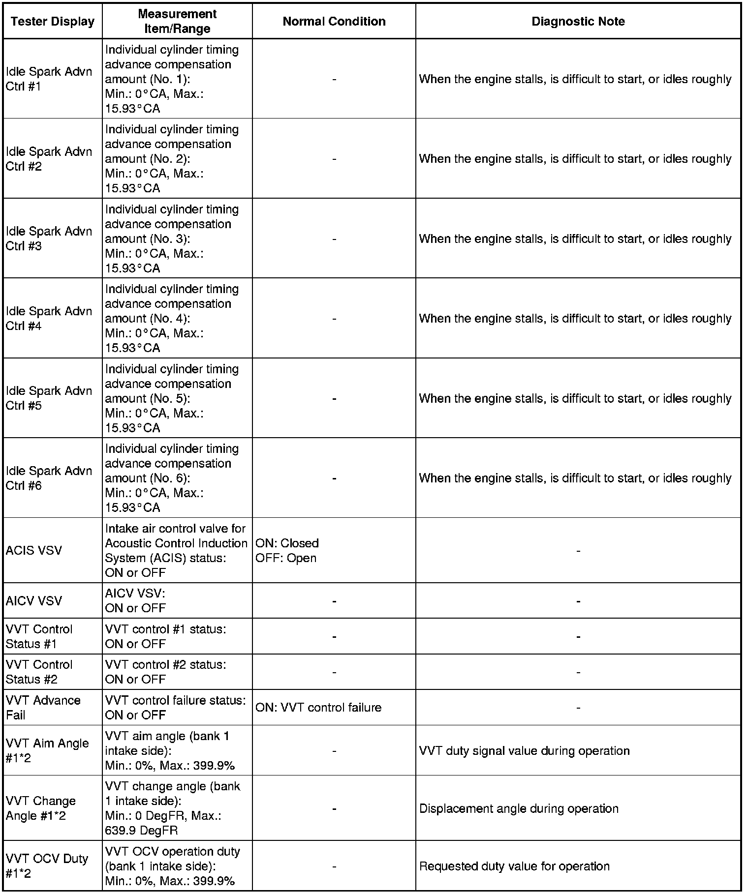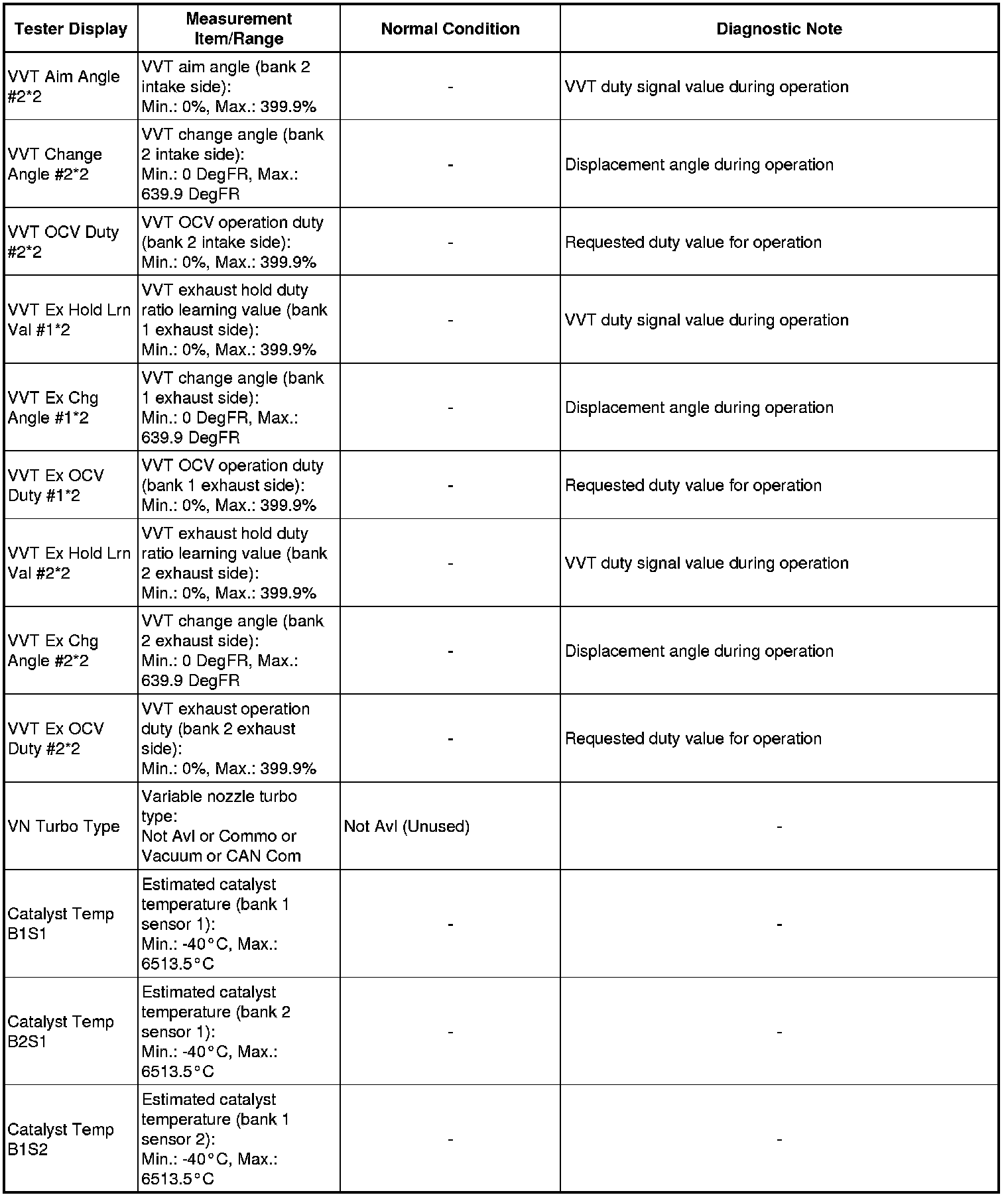 * *2: Data List values are displayed only when performing the following Active Tests: Control the VVT System (Bank 1), Control the VVT System (Bank 2), Control the VVT Linear (Bank1), Control the VVT Linear (Bank2), Control the VVT Exhaust Linear (Bank1) and Control the VVT Exhaust Linear (Bank2). For other Active Tests, the Data List value will be 0.