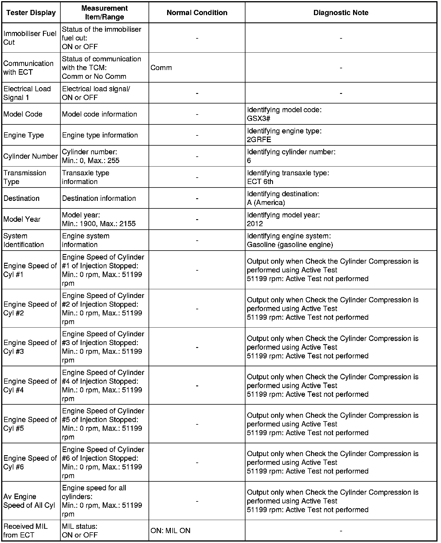 In this Active Test, the fuel and ignition of all cylinders is cut. The engine must then be cranked for approximately 10 seconds. At this time, the speed of each cylinder is measured. If the speed of one cylinder is more than the other cylinders, it can be determined that the compression pressure of that cylinder is lower than the other cylinders.