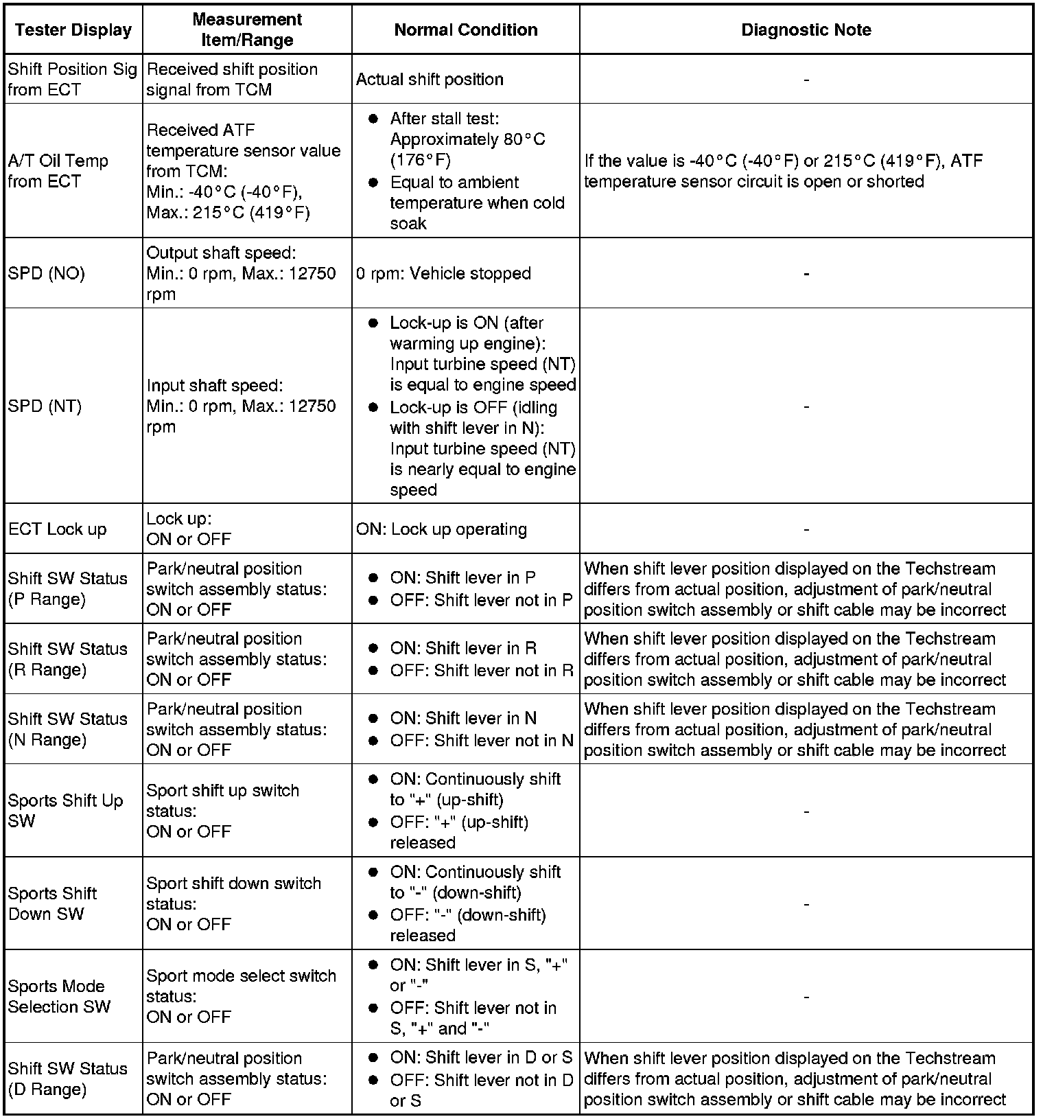 Using the Techstream to read the Data List allows the values or states of switches, sensors, actuators and other items to be read without removing any parts. This non-intrusive inspection can be very useful because intermittent conditions or signals may be discovered before parts or wiring is disturbed. Reading the Data List information early in troubleshooting is one way to save diagnostic time.