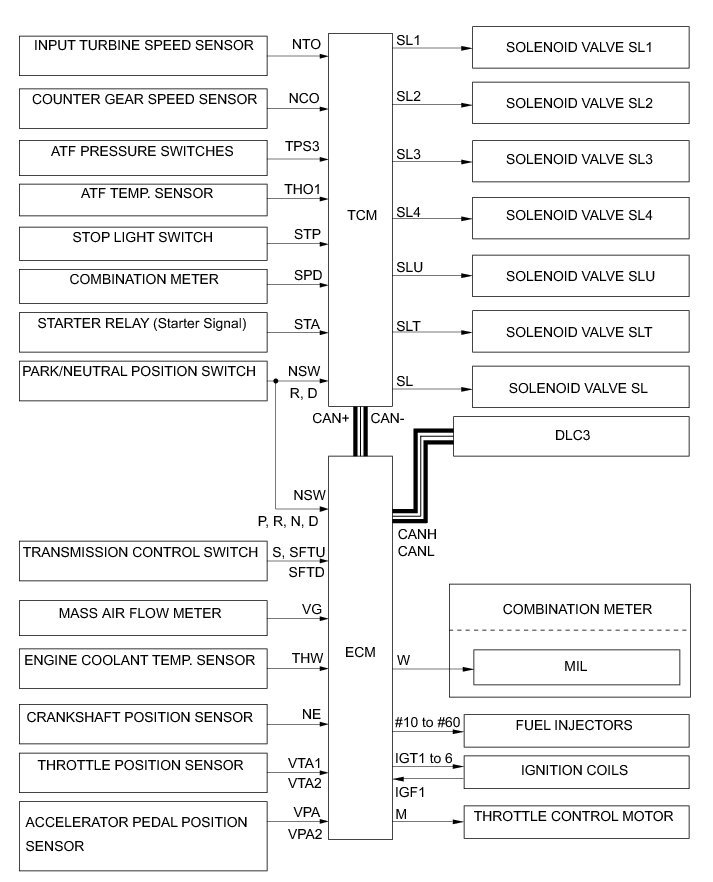The configuration of the electronic control system in the U660E automatic transaxle is as shown in the following chart.
