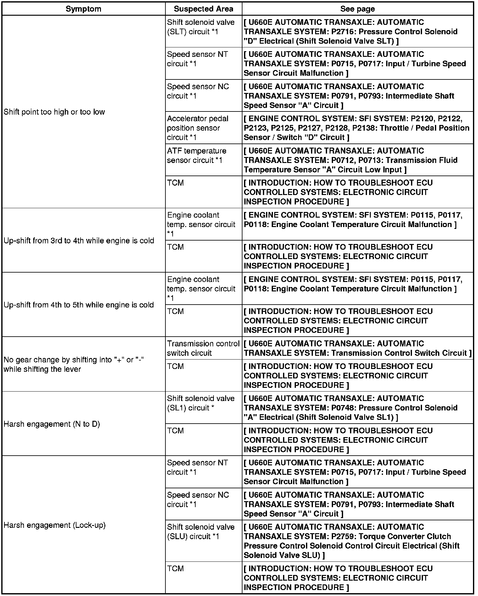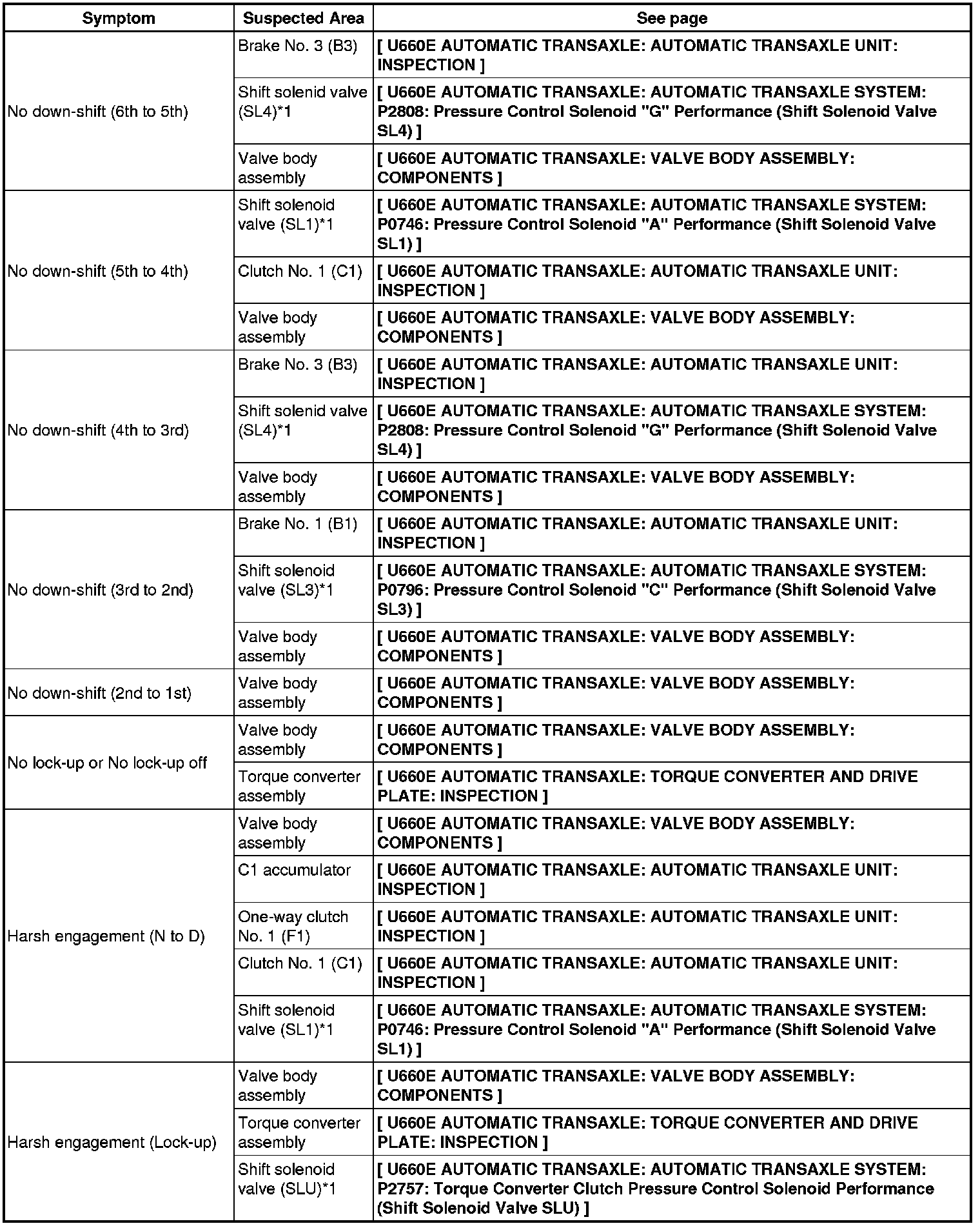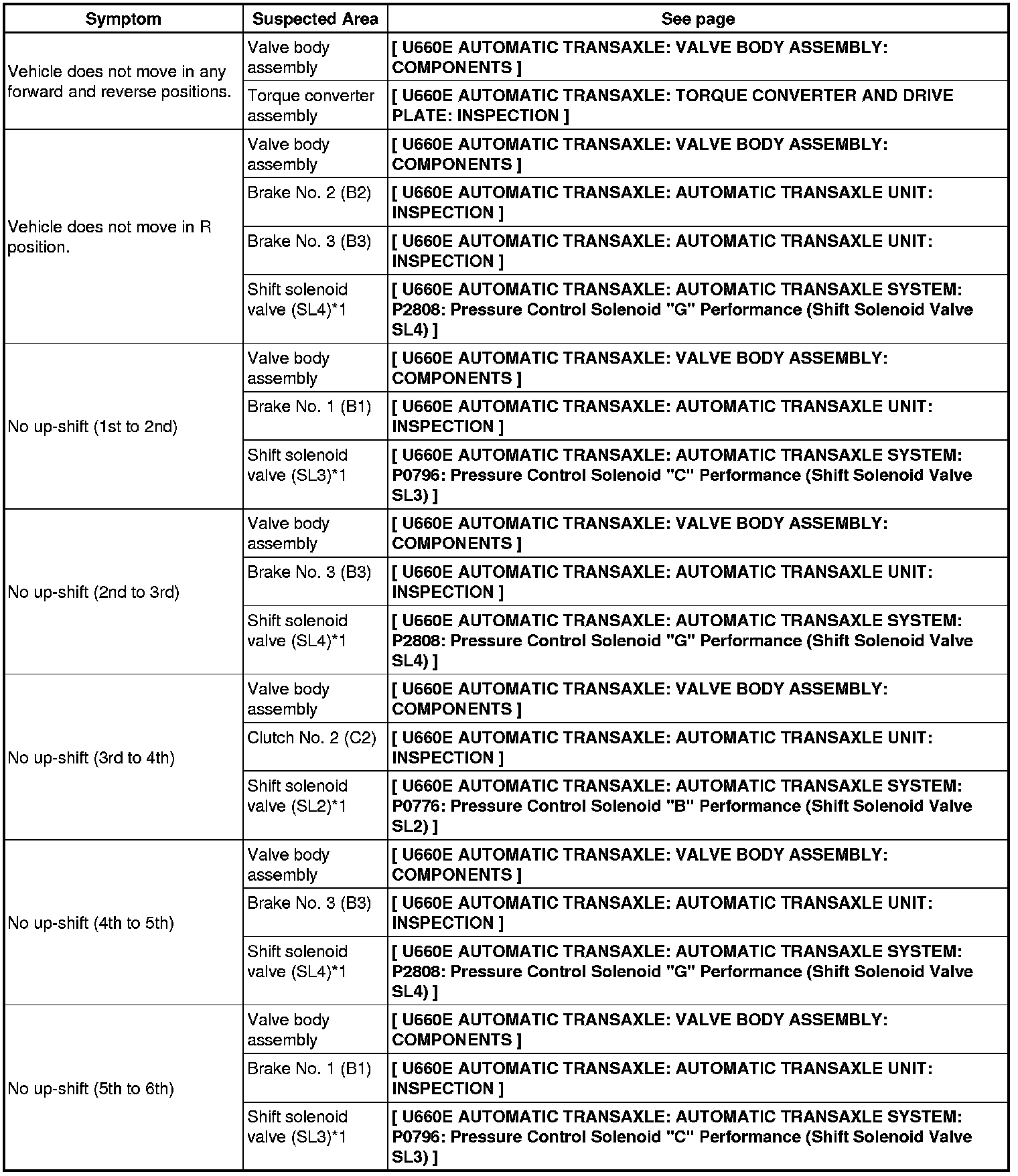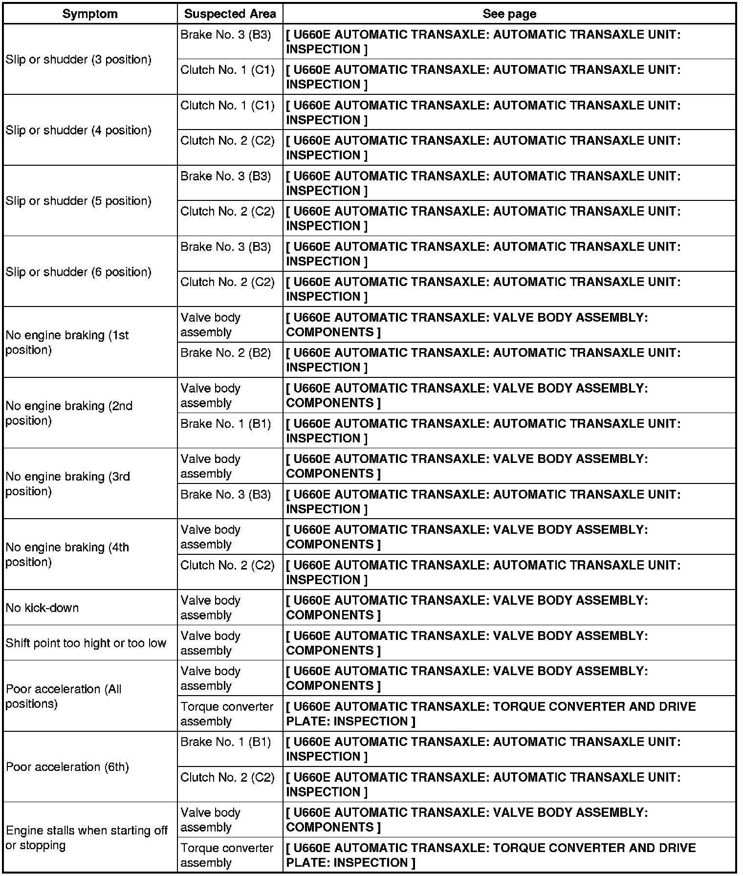 U660E AUTOMATIC TRANSAXLE: AUTOMATIC TRANSAXLE SYSTEM: PROBLEM SYMPTOMS TABLE