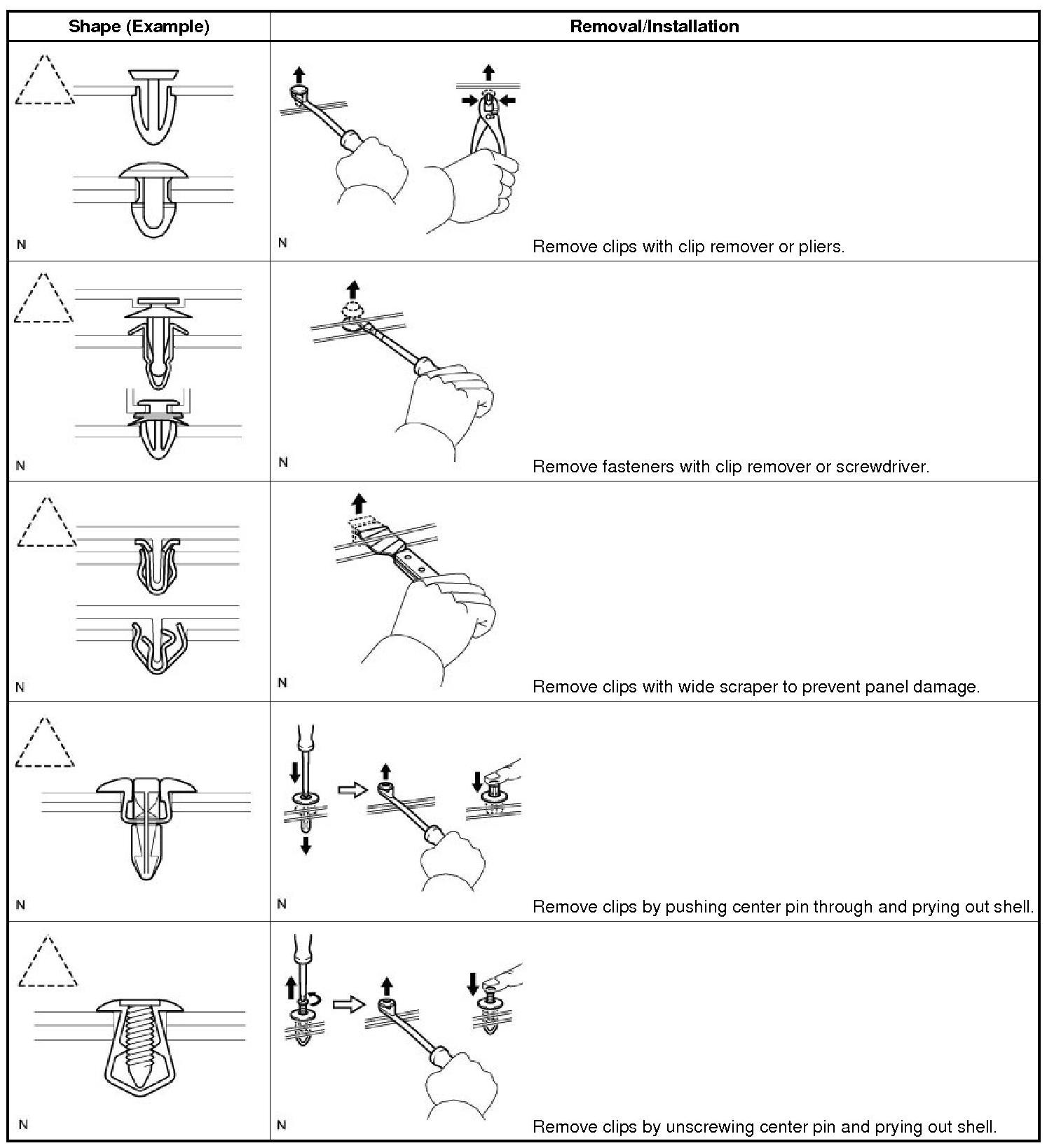 (1) The removal and installation methods of typical clips used in body parts are shown in the table below.
