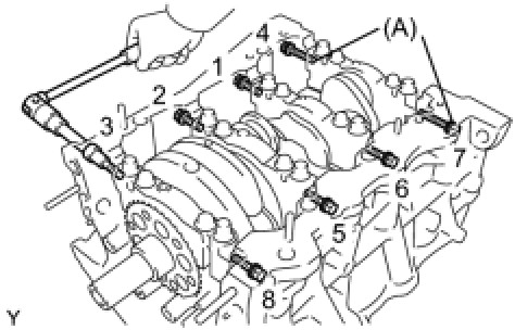 Install 8 new seal washers and uniformly tighten the 8 crankshaft bearing cap bolts in several steps and in the sequence shown in the illustration.