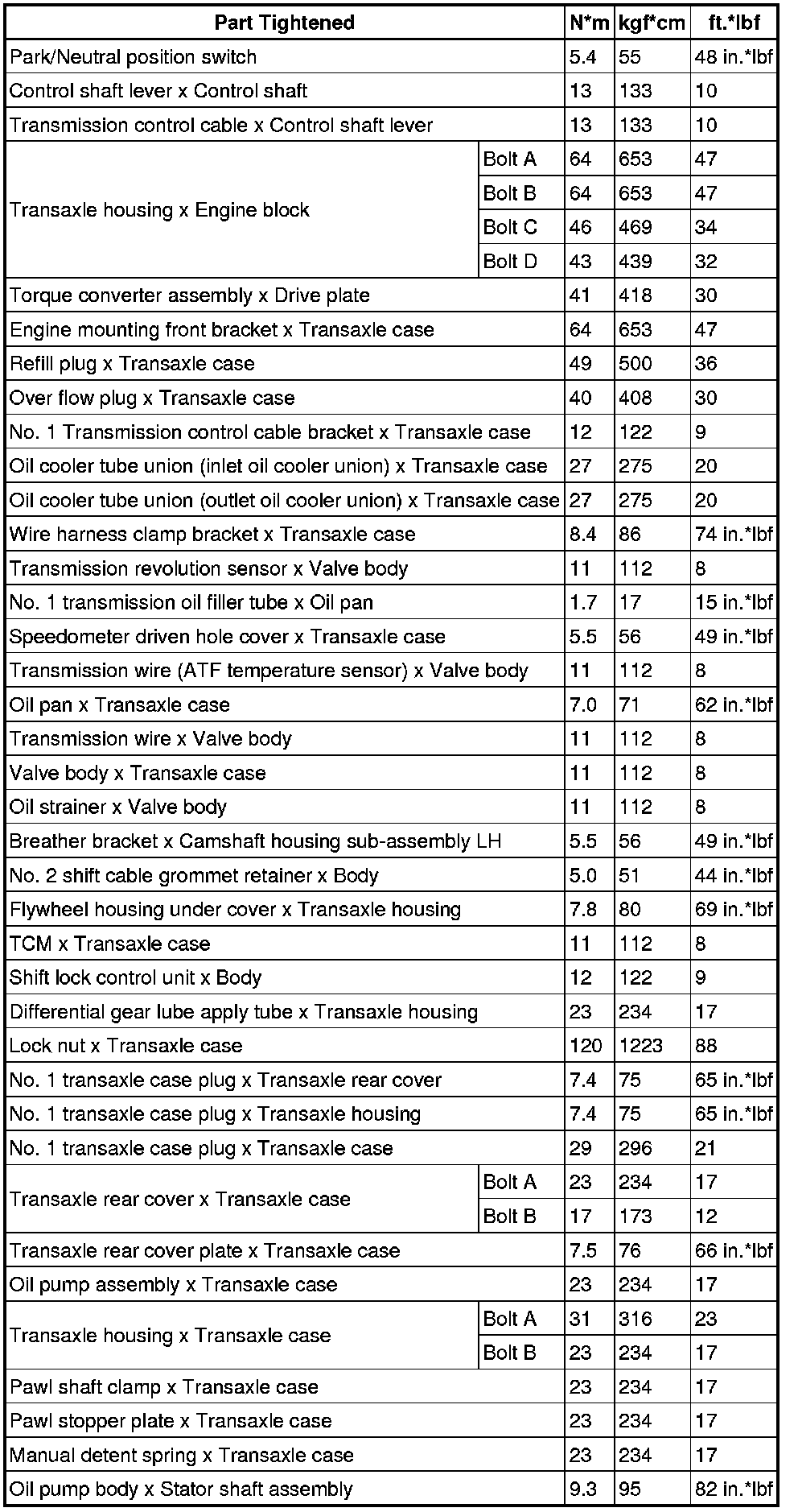SERVICE SPECIFICATIONS: U660E AUTOMATIC TRANSAXLE: TORQUE SPECIFICATIONS