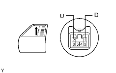 (6) Approximately 60 seconds later, connect the battery's positive (+) lead to terminal 2 (U) and the negative (-) lead to terminal 1 (D). Check that the window begins to descend.