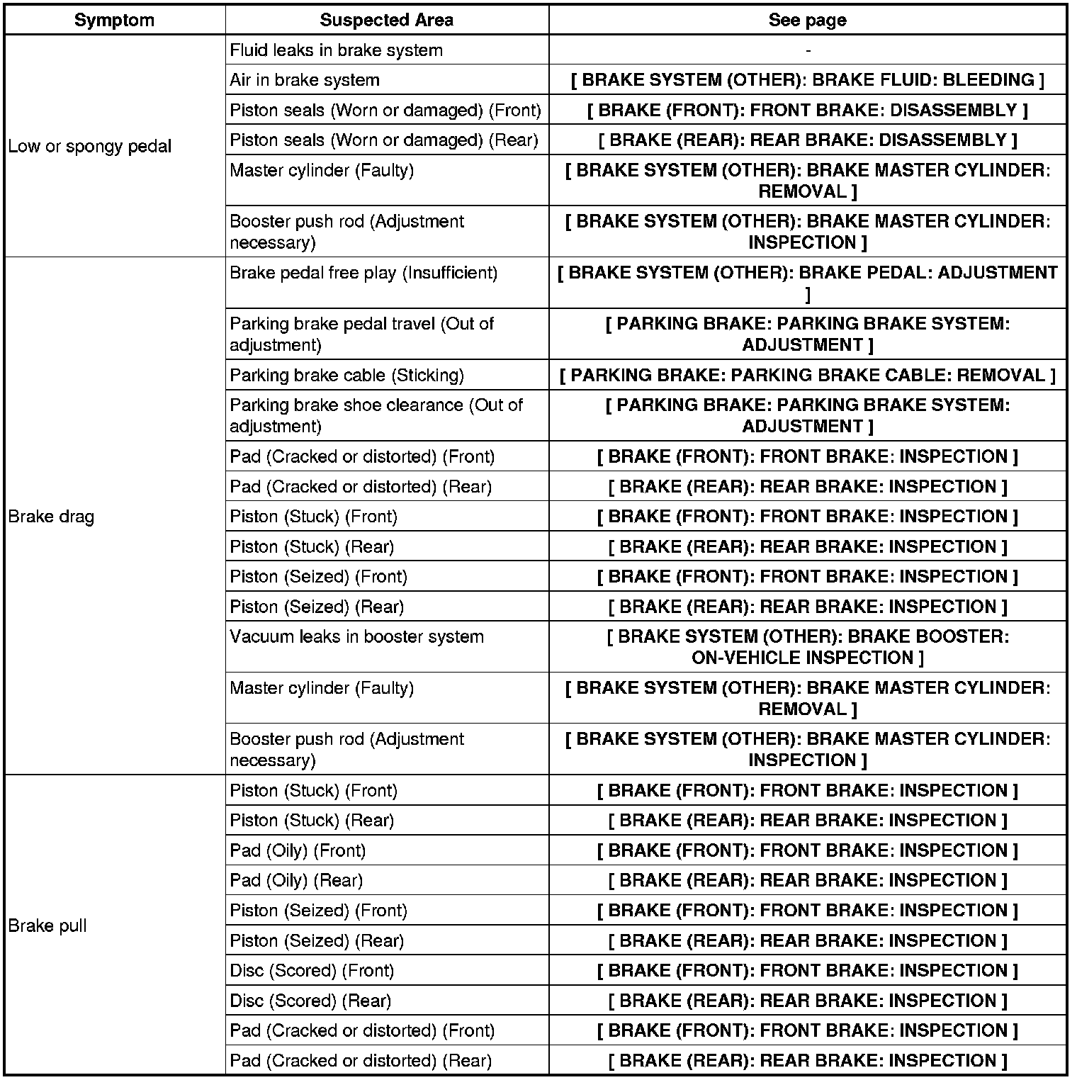 BRAKE SYSTEM (OTHER): BRAKE SYSTEM: PROBLEM SYMPTOMS TABLE