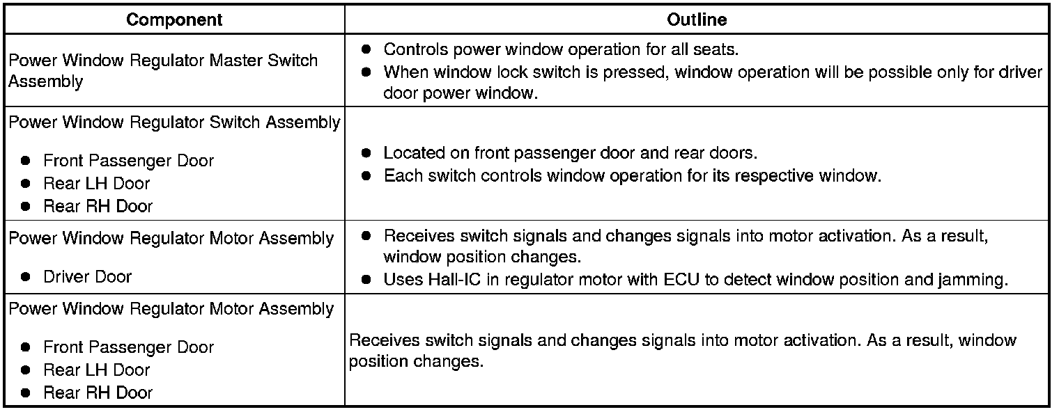 (a) The power window control system controls the power window operation using the power window regulator motors. The main controls of this system are the power window regulator master switch assembly, which is mounted on the driver door, and the power window regulator switches, which are mounted on the front passenger door and rear doors. Operating a window switch results in electrical power being transmitted to the corresponding power window regulator motor.