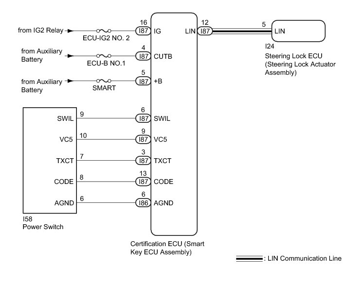 * The smart key system (for Entry Function) uses a multiplex communication system (LIN communication system) and the CAN communication system. Inspect the communication function by following How to Proceed with Troubleshooting How To Proceed With Troubleshooting. Troubleshoot the smart key system (for Entry Function) after confirming that the communication systems are functioning properly.
