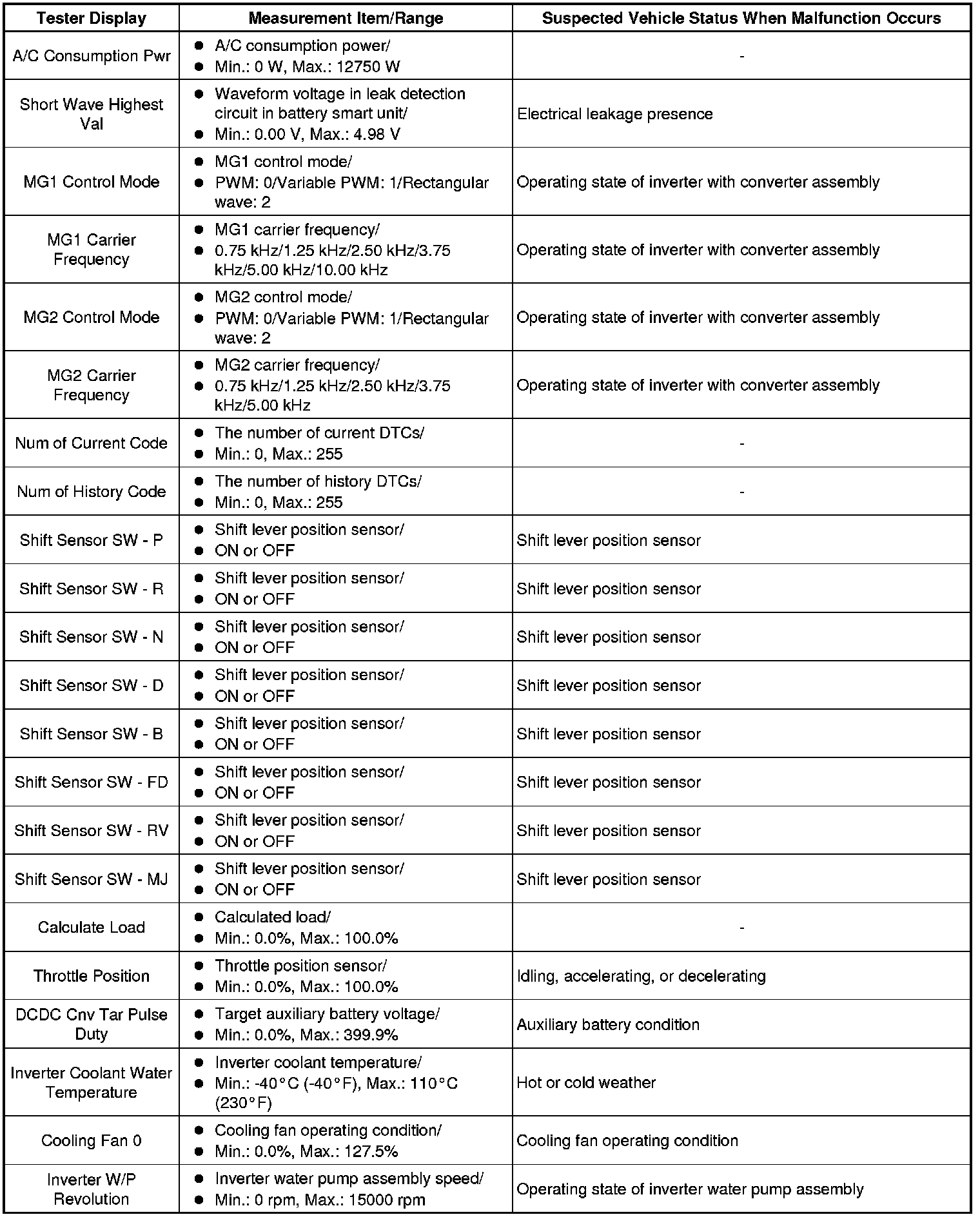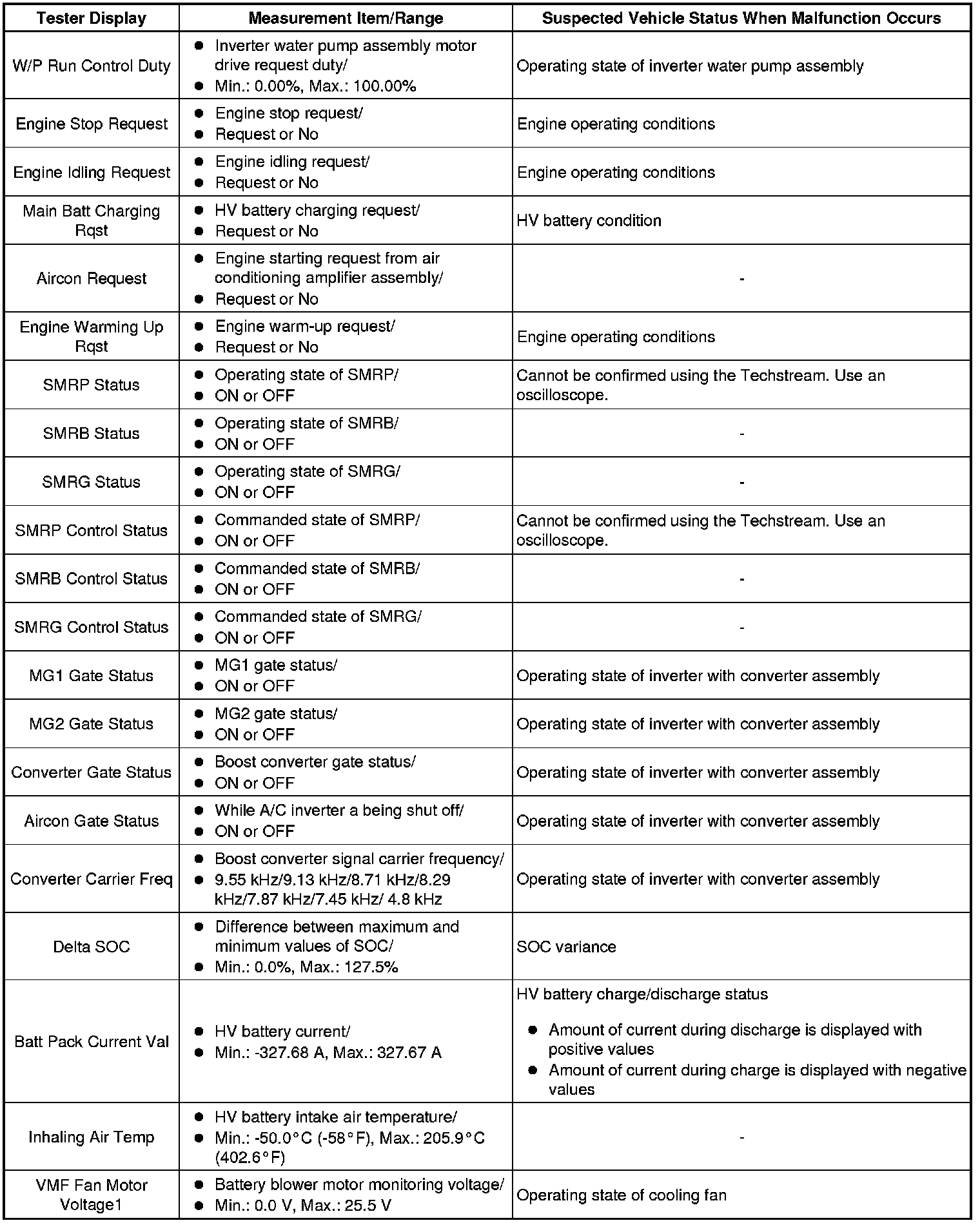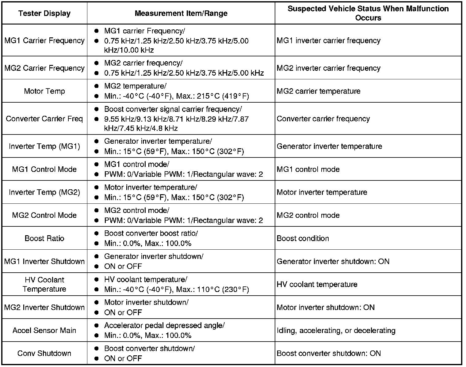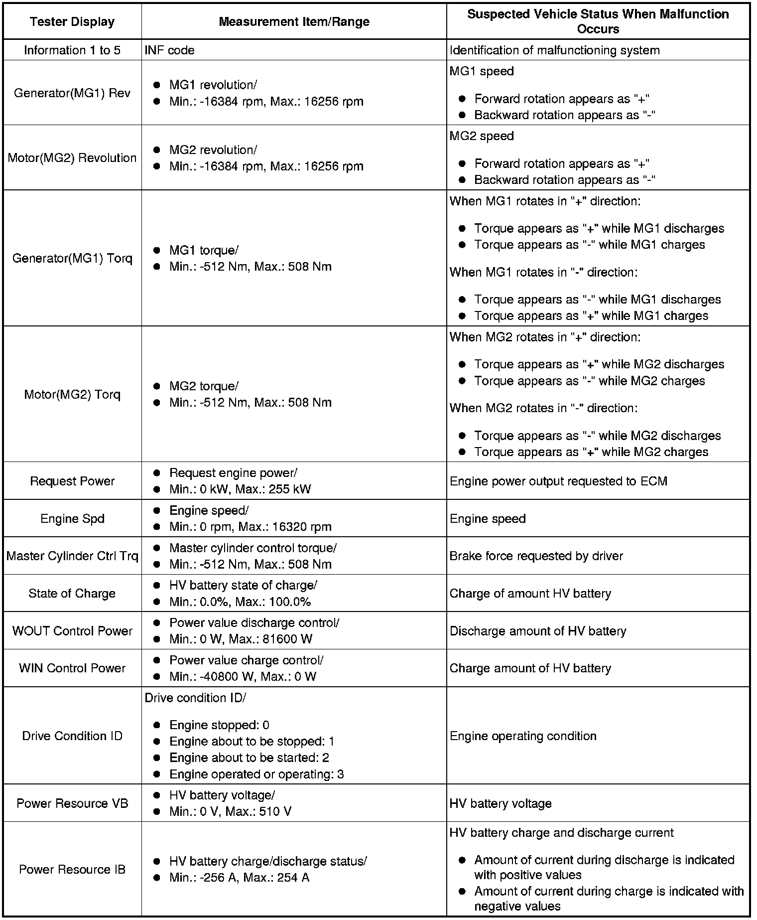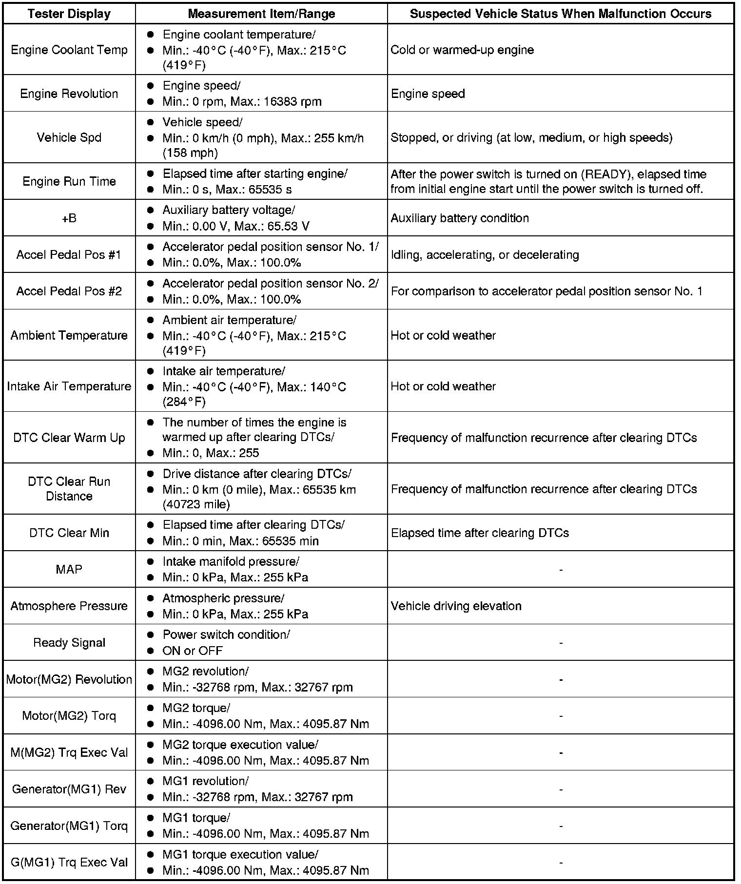 The power management control ECU records vehicle and driving condition information as freeze frame data the moment a DTC is stored. It can be used for estimating or duplicating the vehicle conditions that were present when the malfunction occurred. To confirm the details of the hybrid control system, check the detailed information for the DTC information code in the Data List (INF code).