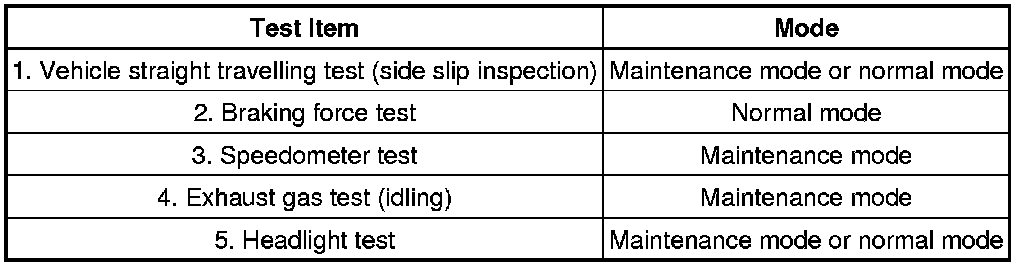 Different types of inspection mode are available. One is maintenance mode, and the other is certification mode. The following table indicates the mode appropriate for each test item.