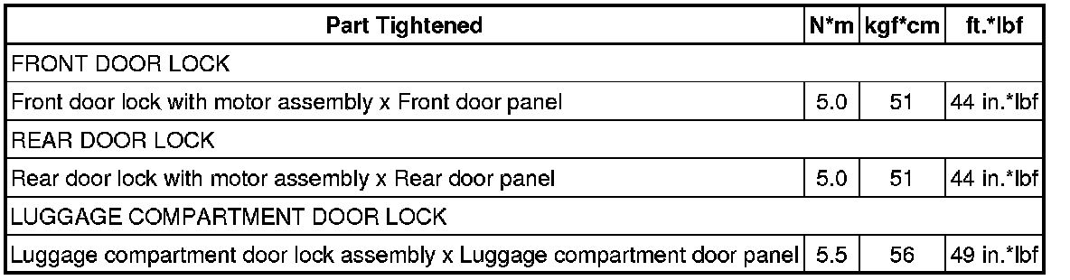SPECIFICATIONS: DOOR LOCK: TORQUE SPECIFICATIONS