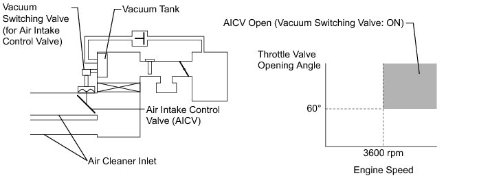 When the engine is operating in the low-to-mid speed range, this control operates the air intake control valve to close one of the air cleaner inlets. When the engine speed is higher than 3600 rpm and the opening angle of the throttle valve is more than 60°, the ECM activates the vacuum switching valve (for air intake control valve) and opens the air intake control valve.