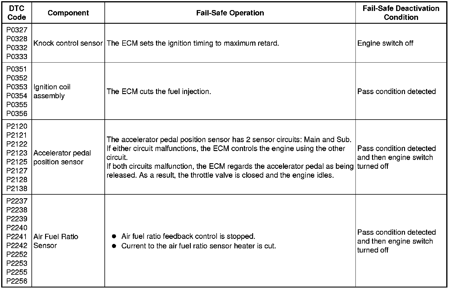 If any of the following DTCs are stored, the ECM enters fail-safe mode to allow the vehicle to be driven temporarily or stops fuel injection.