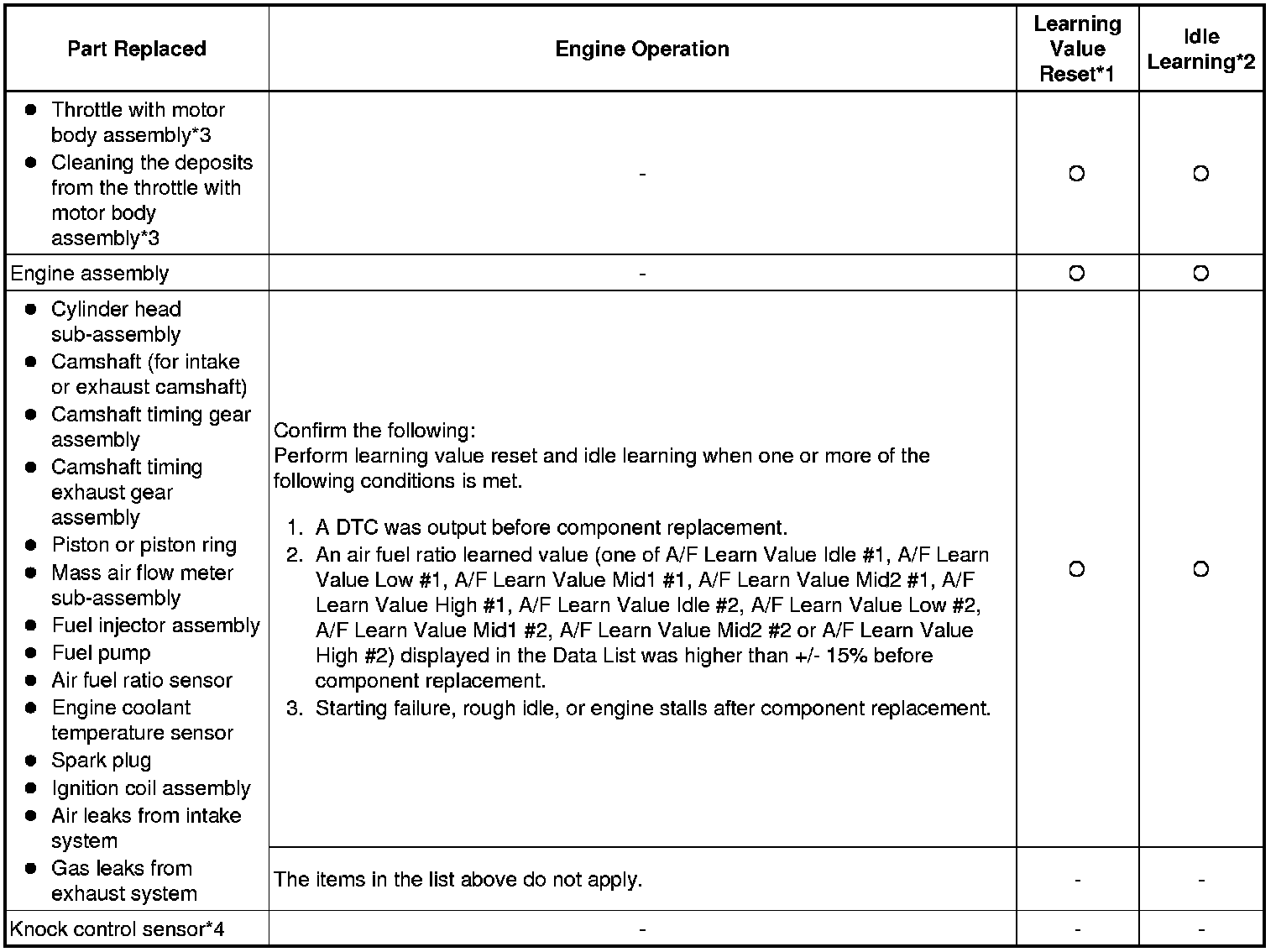 Perform learning value reset and idle learning after replacing or servicing parts related to engine operation. Details on procedures required are indicated by an asterisk and a number, and are explained in detail following the table.