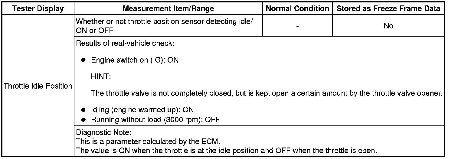 Normal Condition: If no conditions are specifically stated for "idling", the shift lever should be in N or P, the A/C switch should be off and all accessory switches should be off.