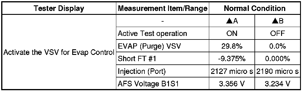 Even when the Active Test is turned on (the purge VSV is opened 30%), air fuel ratio feedback continues and control is performed so that the air fuel ratio is the stoichiometric ratio. Therefore, by observing the change in "Short FT", it is possible to determine whether the purge VSV is actually open as well as the concentration of HC in the purge gas.