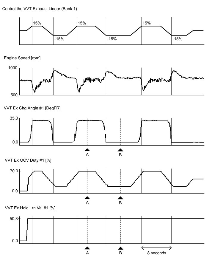 * The sum of the control value for the Control the VVT Exhaust Linear Active Test and the value of VVT Ex Hold Lrn Val is approximately equal to the value of VVT Ex OCV Duty.