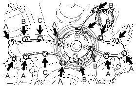 Install a new gasket and the engine water pump assembly together with the water pump pulley with the 16 bolts.