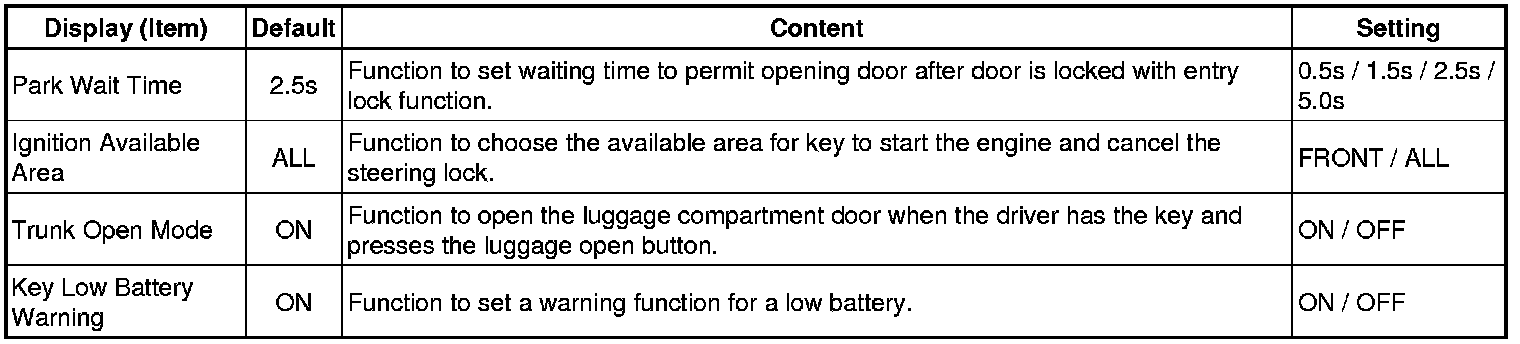 THEFT DETERRENT / KEYLESS ENTRY: SMART KEY SYSTEM (for Entry Function): CUSTOMIZE PARAMETERS