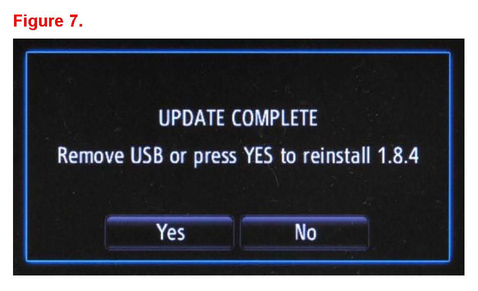 10. When finished an "UPDATE COMPLETE Remove USB or press YES to reinstall XXX" message will be displayed.