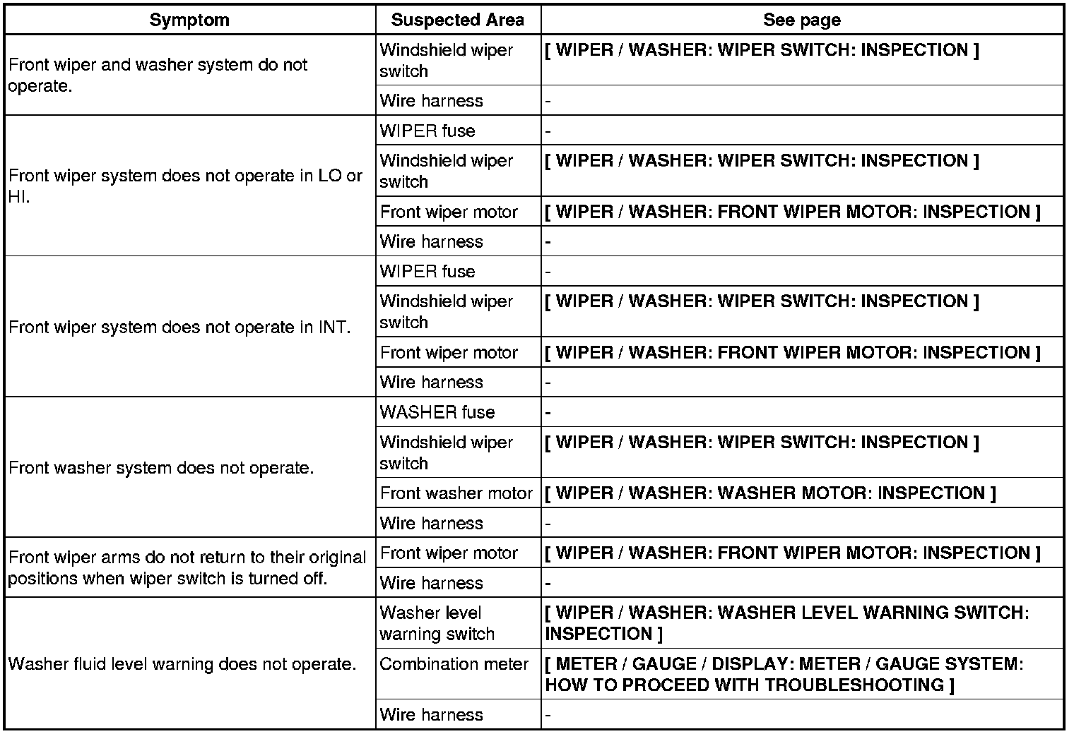 WIPER / WASHER: WIPER AND WASHER SYSTEM: PROBLEM SYMPTOMS TABLE