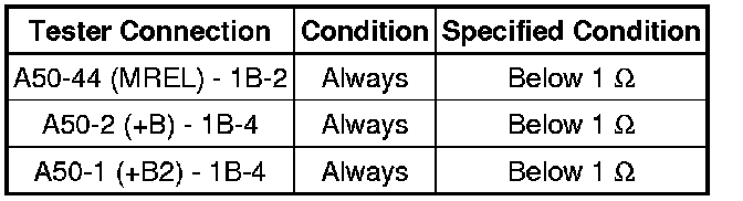 When the ignition switch is turned to ON, the battery voltage is applied to the IGSW terminal of the ECM. The output signal from the MREL terminal of the ECM causes a current to flow to the EFI MAIN relay coil, closing the EFI MAIN relay contacts and supplying power to terminals +B and +B2 of the ECM.