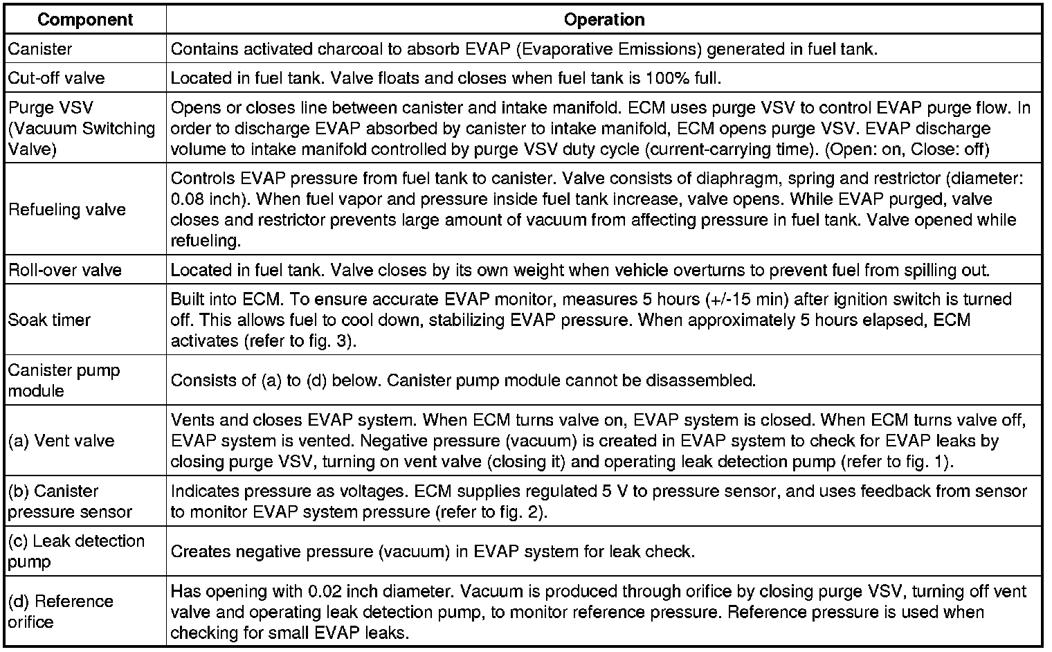 The leak detection pump creates negative pressure (vacuum) in the EVAP system and the pressure is measured. Finally, the ECM monitors for leaks from the EVAP system, and malfunctions in both the canister pump module and purge VSV based on the EVAP pressure.