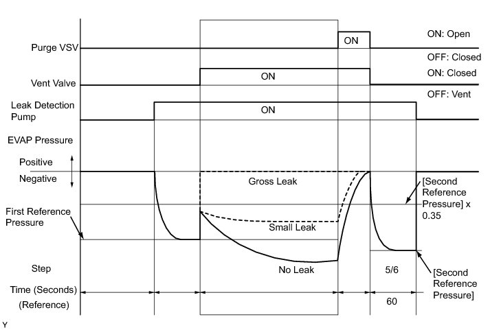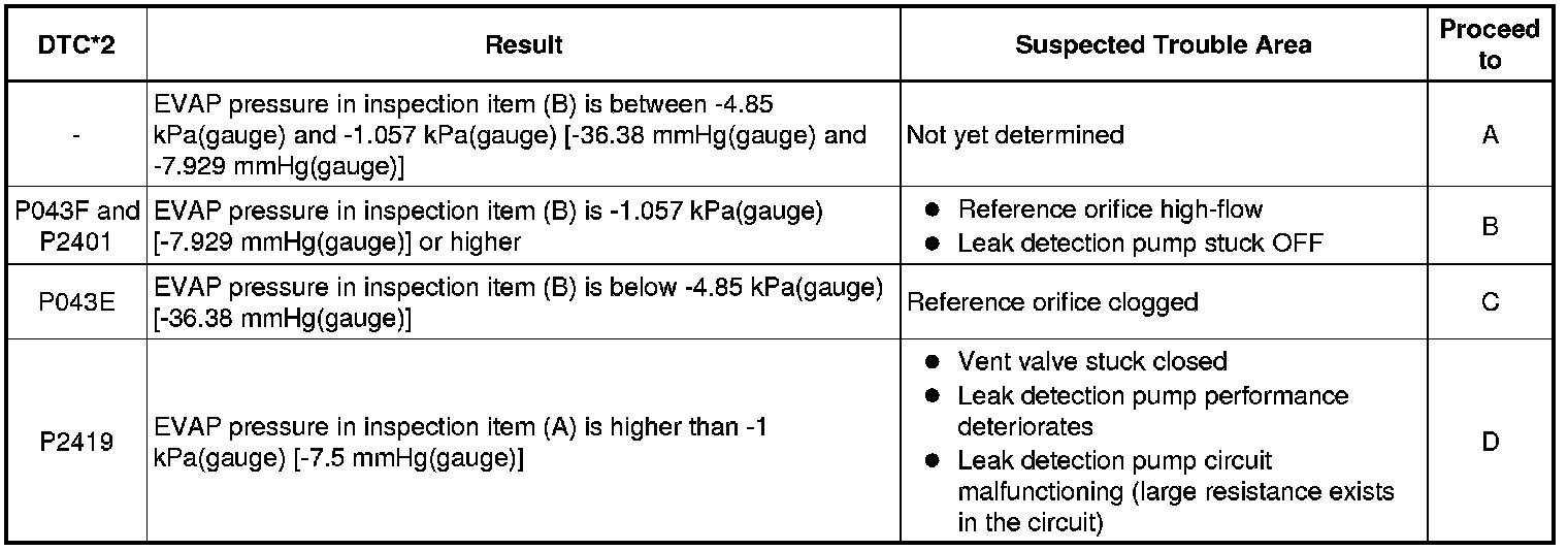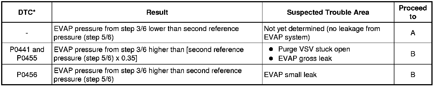 If the reference pressure difference between the first and second checks is more than the specification, all the DTCs relating to the reference pressure (P043E, P043F, P0441, P0455, P0456, P2401, P2420) will all be stored.