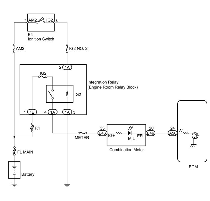 The MIL (Malfunction Indicator Lamp) is used to indicate vehicle malfunction detections by the ECM. When the ignition switch is turned to ON, power is supplied to the MIL circuit, and the ECM provides the circuit ground which illuminates the MIL.