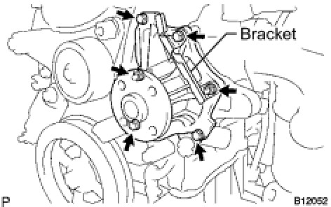Install the water pump and clamp bracket with the 4 bolts and 2 nuts.