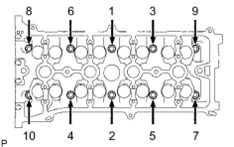Using several steps, uniformly install and tighten the 10 cylinder head set bolts and plate washers with a 10 mm bi-hexagon wrench in the order shown in the illustration.