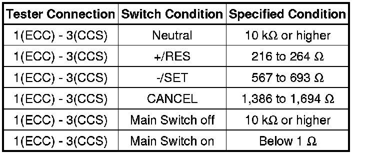 If the result is not as specified, replace the cruise control main switch.