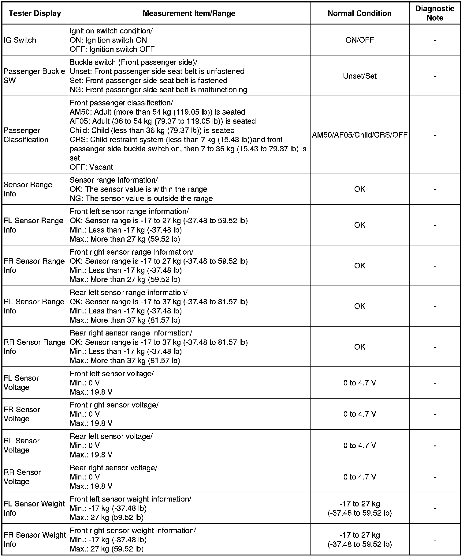 1. DATA LIST FOR OCCUPANT CLASSIFICATION ECU