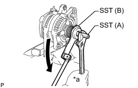 (c) Use a wrench to hold SST (A) and turn SST (B) counterclockwise to loosen the generator with clutch pulley.