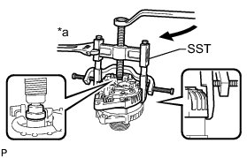 Be careful as the generator with clutch pulley or generator rotor shaft may be damaged if the position of SST is not securely maintained while performing this operation.