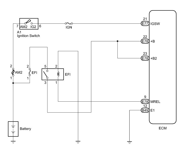 When the ignition switch is turned to ON, the battery voltage is applied to terminal IGSW of the ECM. The ECM MREL output signal causes a current to flow to the coil, closing the contacts of the EFI relay and supplying power to terminal +B of the ECM.