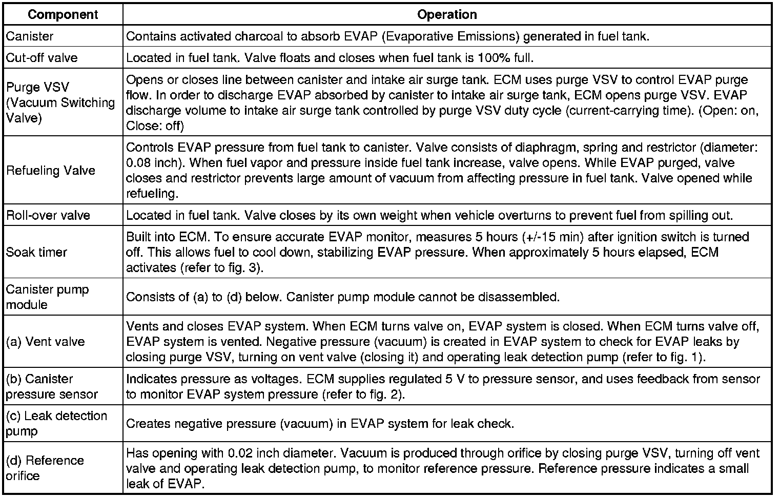 The leak detection pump creates negative pressure (vacuum) in the EVAP system and the pressure is measured. Finally, the ECM monitors for leaks from the EVAP system, and malfunctions in both the canister pump module and purge VSV based on the EVAP pressure.