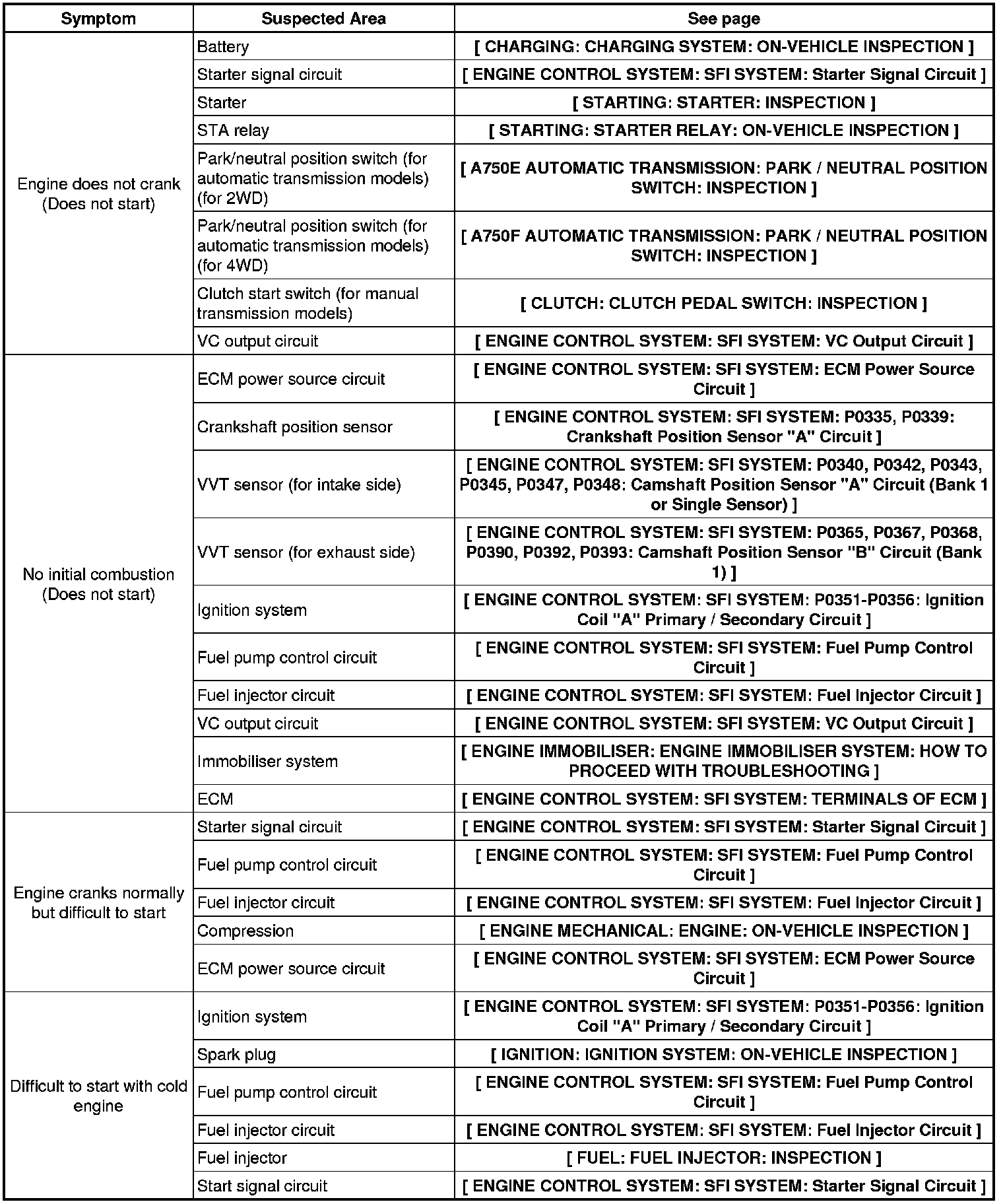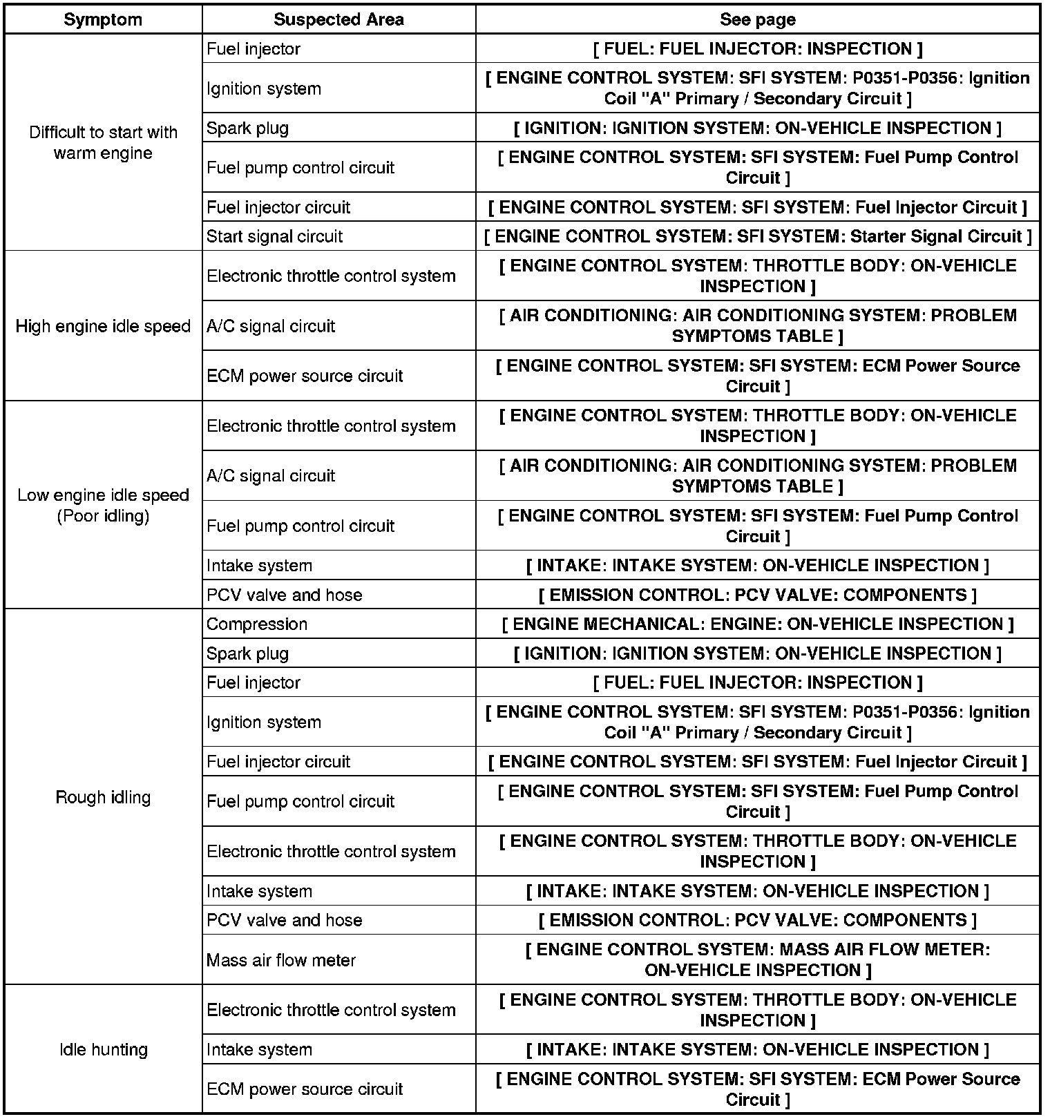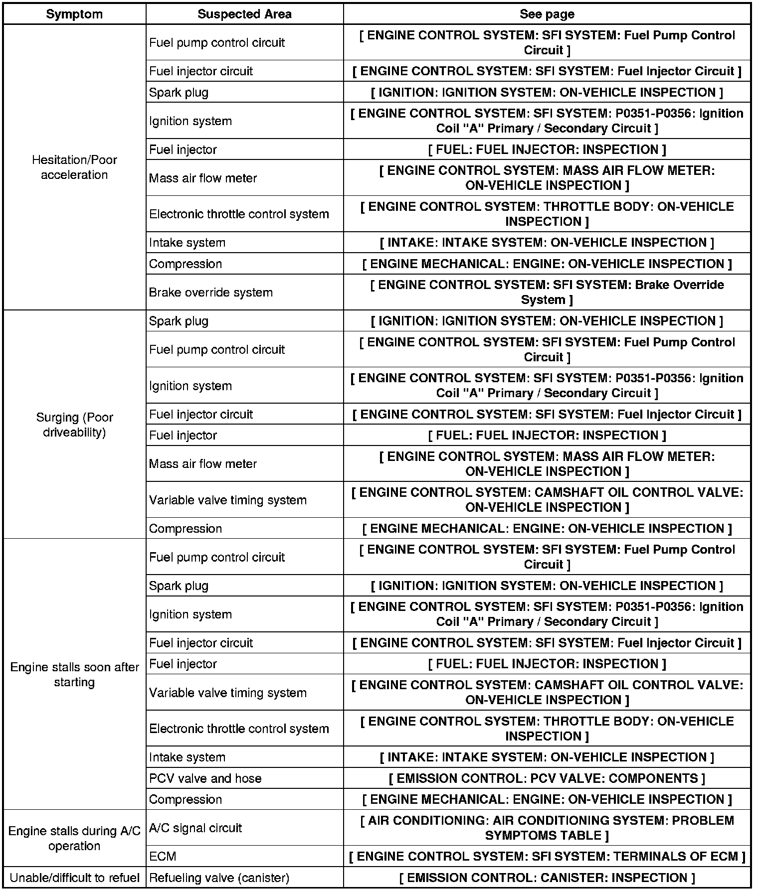 1GR-FE ENGINE CONTROL SYSTEM: SFI SYSTEM: PROBLEM SYMPTOMS TABLE
