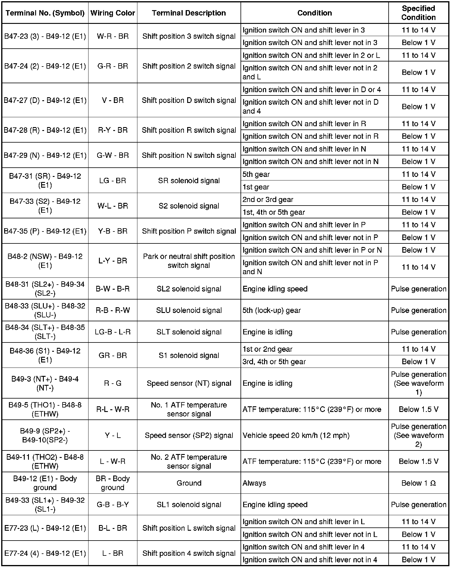 In the table, first follow the information under "Condition". Look under Terminal No. (Symbol) for the terminals to be inspected. The standard voltage and resistance between the terminals is shown under Specified Condition.