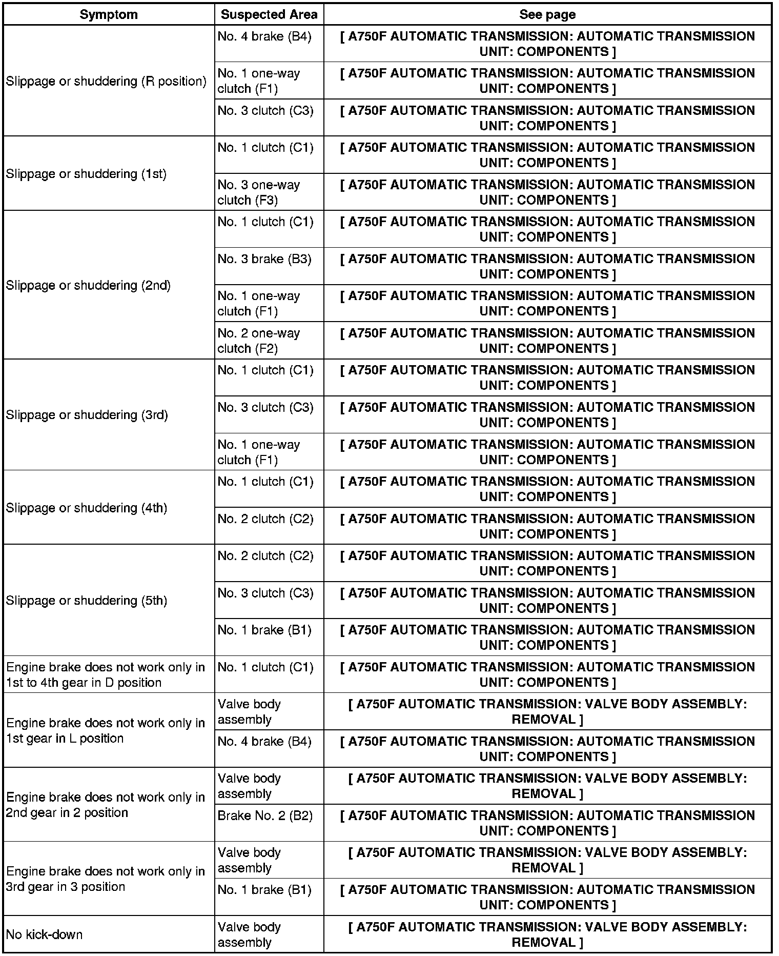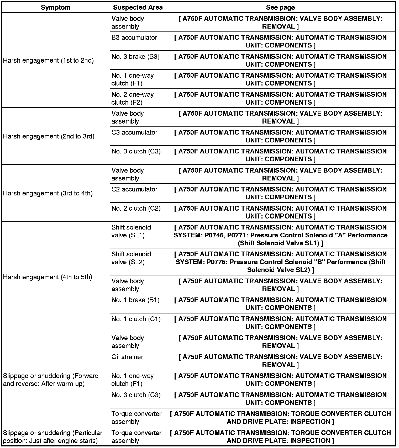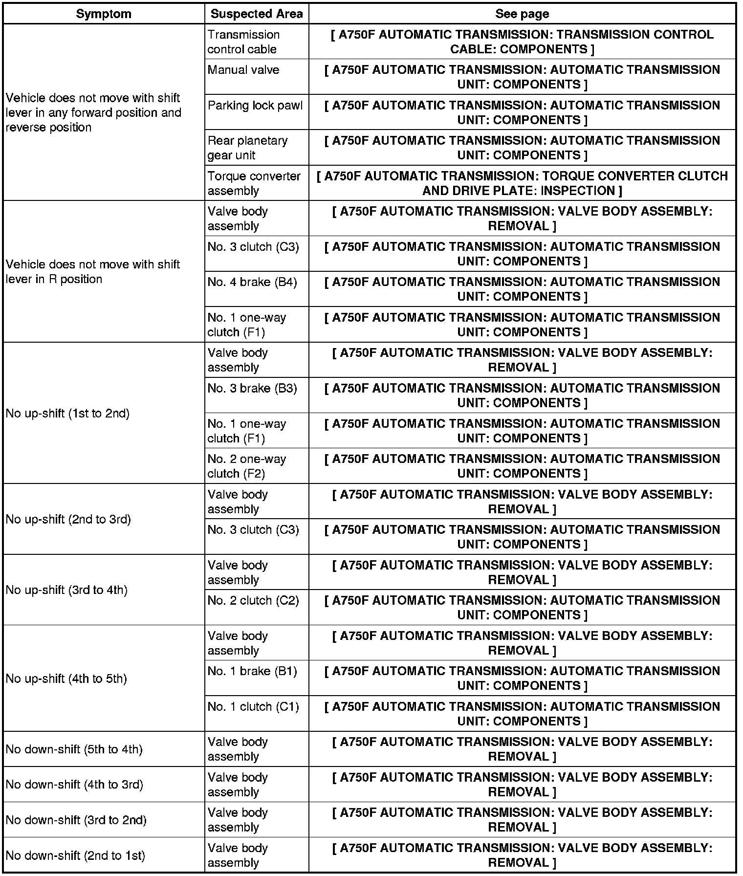 A750F AUTOMATIC TRANSMISSION: AUTOMATIC TRANSMISSION SYSTEM: PROBLEM SYMPTOMS TABLE