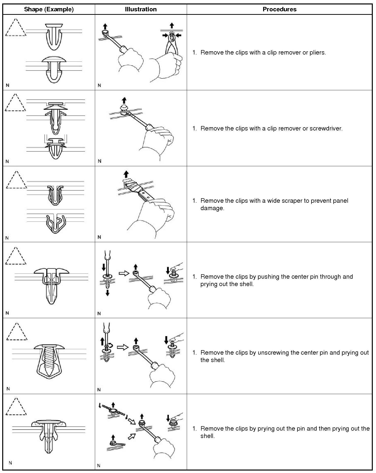 (1) The removal and installation methods of typical clips used for vehicle body parts are shown in the table below.