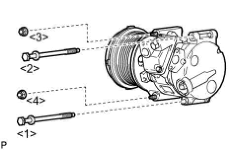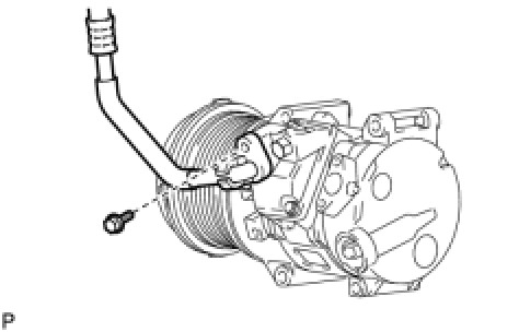 (d) Install the suction hose sub-assembly onto the compressor assembly with pulley with the bolt.