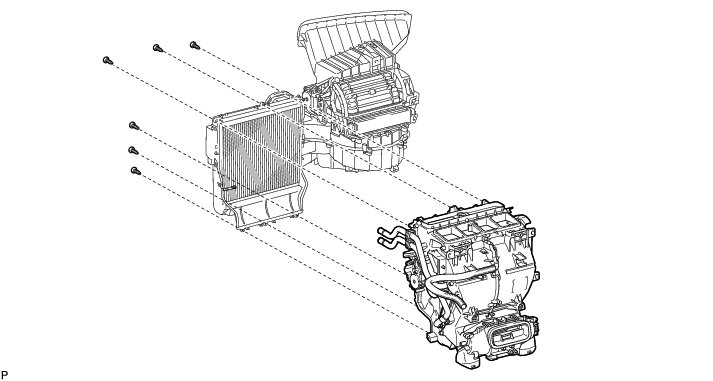 (b) Remove the 6 screws and air conditioning radiator assembly from the blower assembly with evaporator sub-assembly.