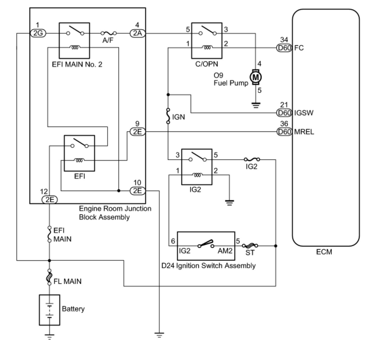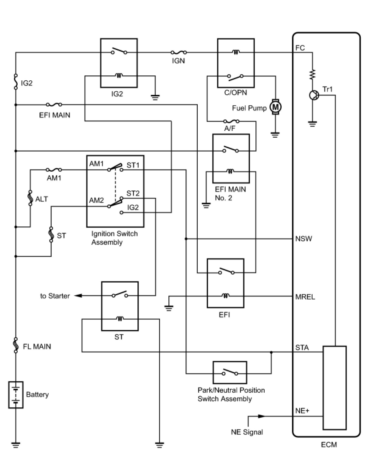When the engine is cranked, the starter relay drive signal output from the ignition switch is input into the STA terminal of the ECM, and the NE signal generated by the crankshaft position sensor is also input into the NE+ terminal. When the ECM interprets that the engine is cranked, it turns transistor Tr1 in the ECM internal circuit on. The current flows to the C/OPN (Circuit Opening) relay when Tr1 is turned on. Then, the fuel pump operates.